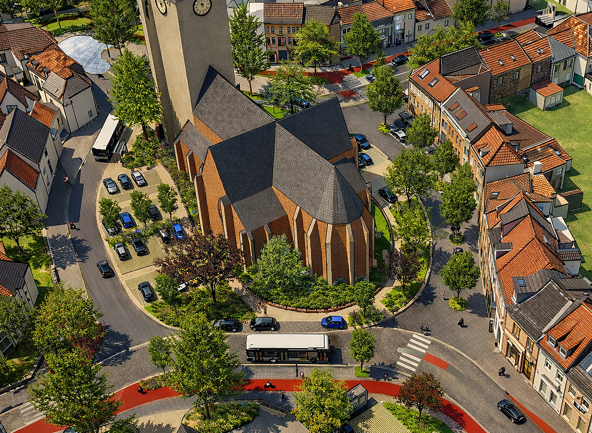 - Mobiliteit: de bestaande buslijnen blijven behouden en krijgen drie integraal toegankelijke bushaltes. Rond de kerk komen fietsenstallingen, parkeerplekken voor deelwagens, elektrische laadpalen en parkeerplaatsen voor mindervaliden. Zo wordt het een plek waar iedereen vlot kan overstappen van het ene op het andere vervoersmiddel.