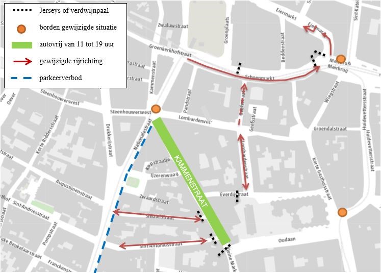 De parkeergeleiding wordt aangepast naar een route zonder de Kammenstraat. Ter hoogte van de Oudaan, de Lombardenvest en de Meirbrug komen verkeersborden met de gewijzigde verkeerssituatie. De Leopoldstraat en Kasteelpleinstraat krijgen signalisatie dat de Kammenstraat autovrij is. Bewoners van de Everdijstraat en de Kammenstraat kunnen een aanvraag doen voor het bedienen van de verdwijnpaal.