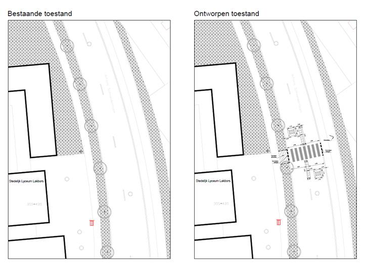 De werken omvatten de aanleg van een zebrapad voor de tijdelijke school, rijbaankussens om de snelheid te remmen, een kort stuk middenberm om omzeilen van de rijbaankussens te voorkomen, en duidelijke signalisatie van de schoolzone.